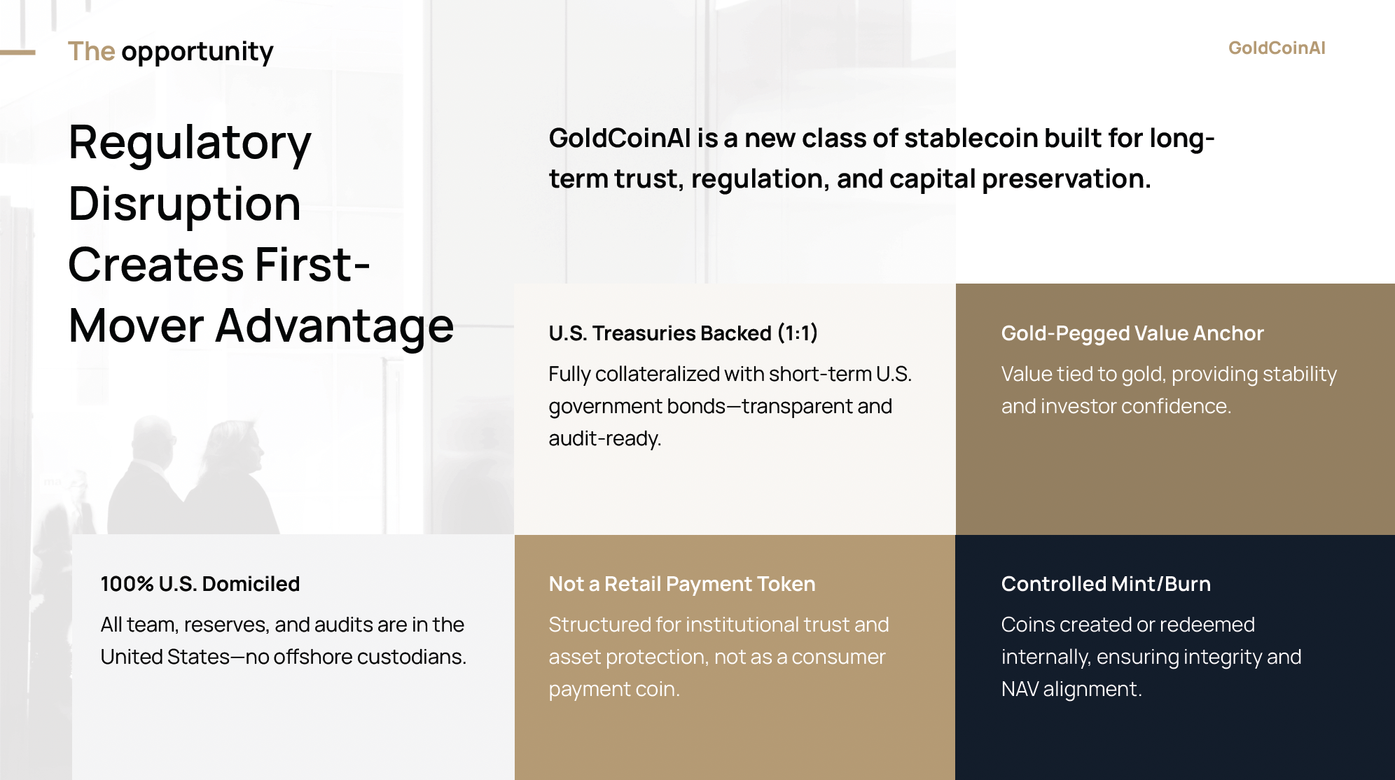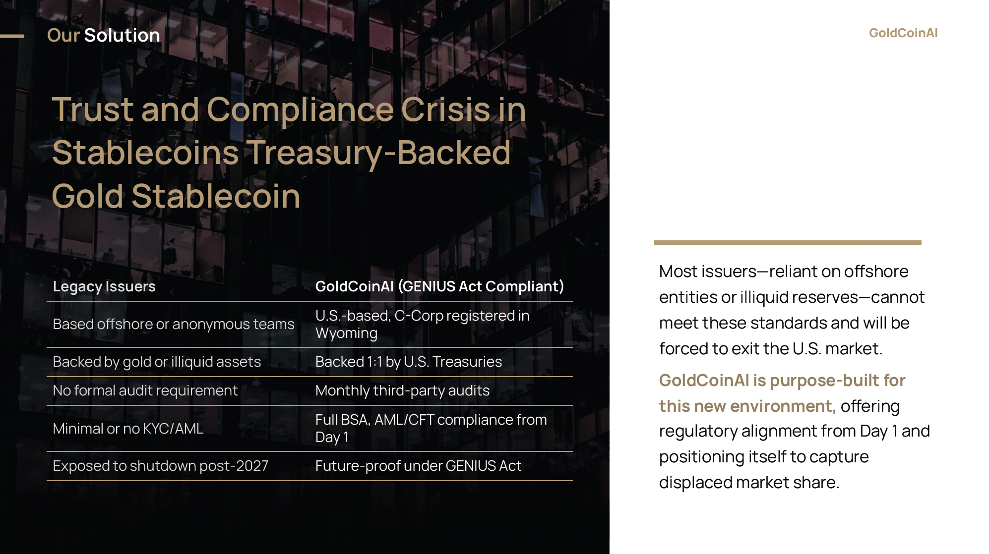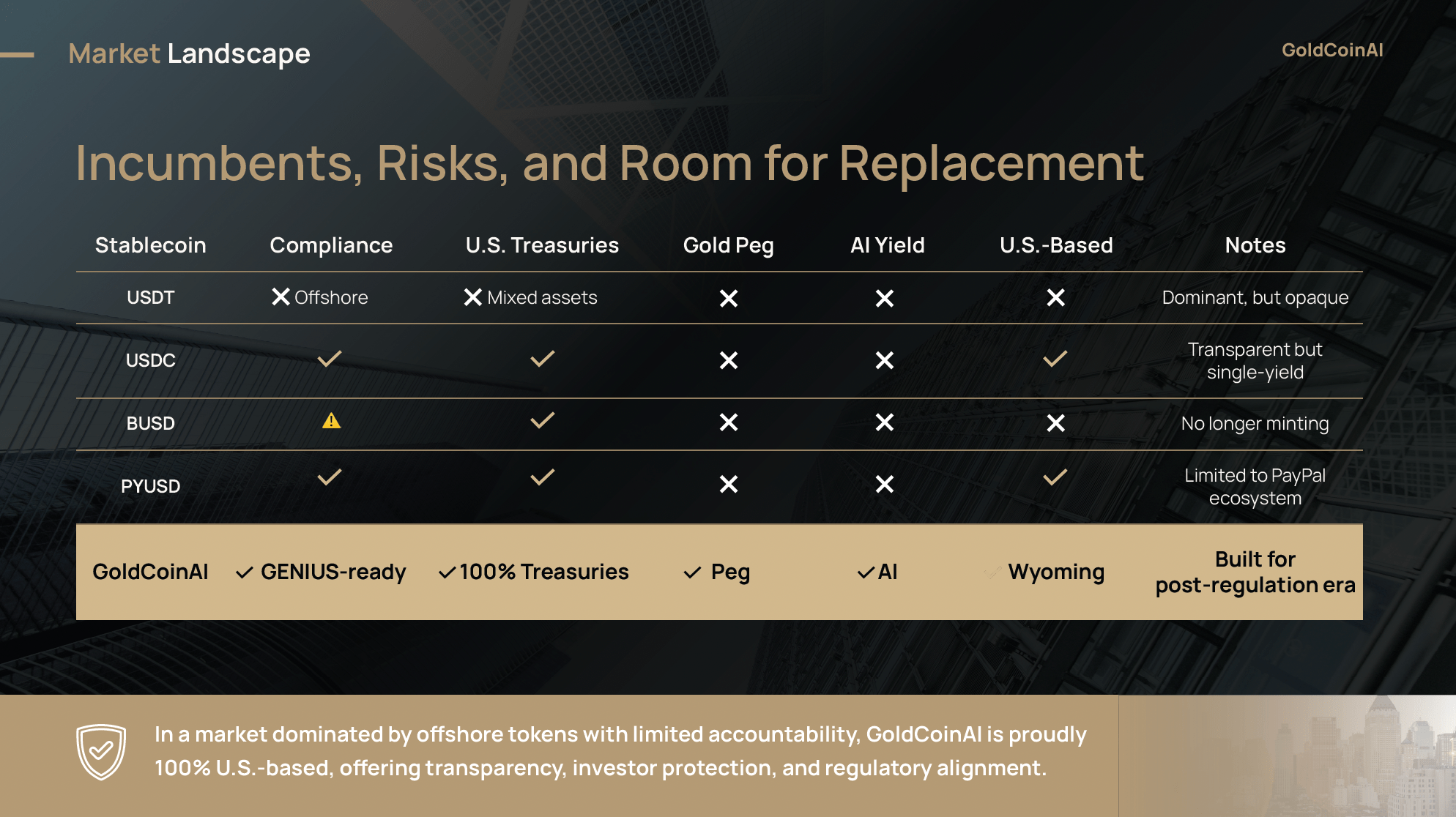 Recent U.S. regulatory developments are forcing many legacy stablecoins—especially those backed by illiquid or offshore assets—out of the market. Gold Coin AI is positioned to capture this displaced market share by offering a first-of-its-kind product tailored for institutional trust and regulatory compatibility.