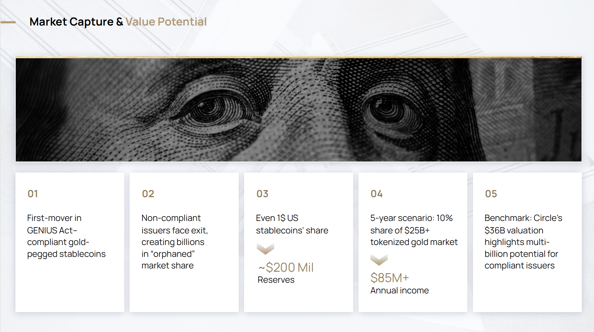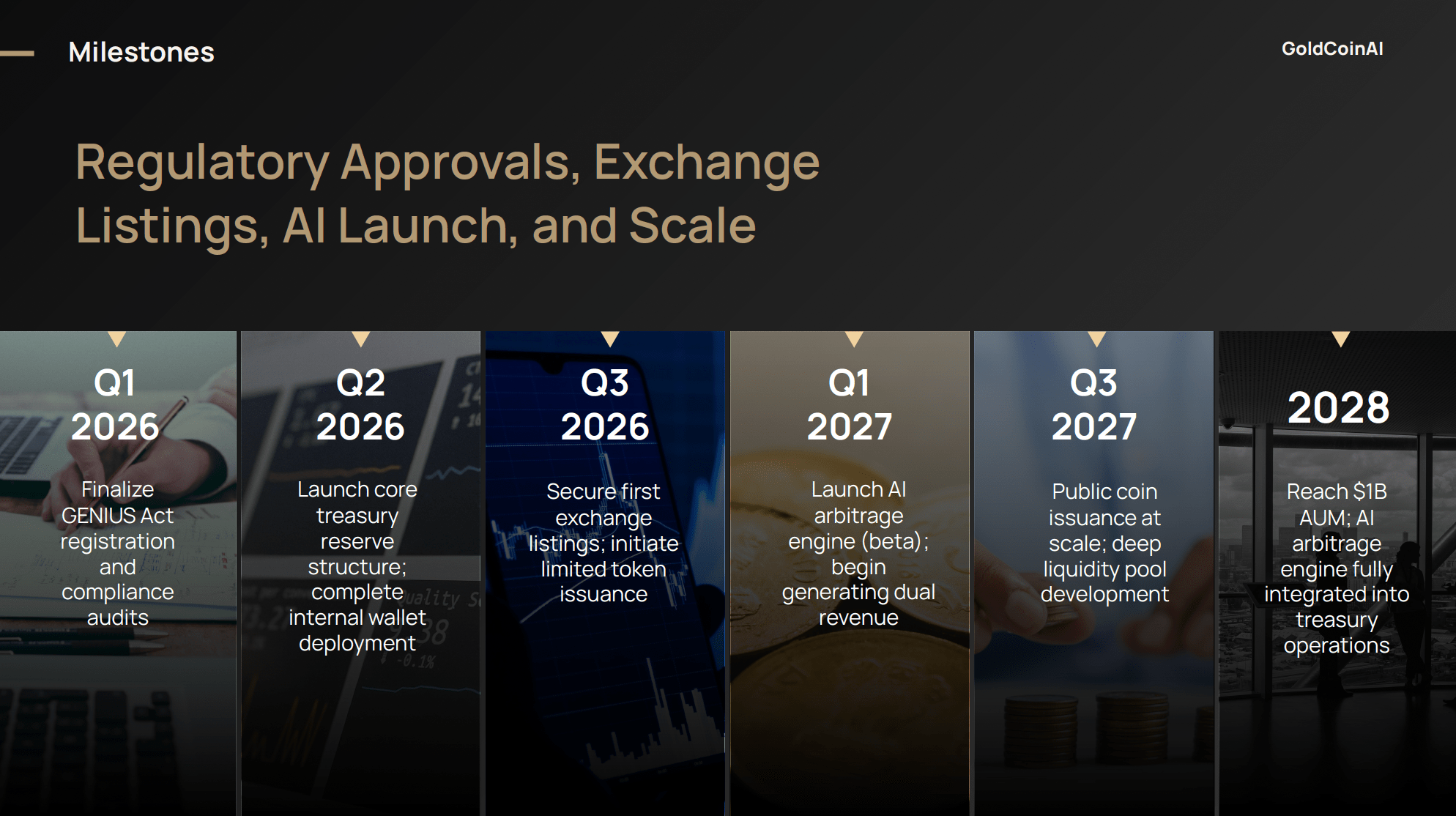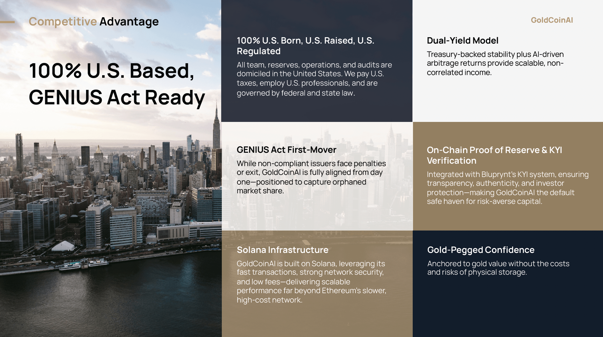 Recent U.S. regulatory developments are forcing many legacy stablecoins—especially those backed by illiquid or offshore assets—out of the market. Gold Coin AI is positioned to capture this displaced market share by offering a first-of-its-kind product tailored for institutional trust and regulatory compatibility.