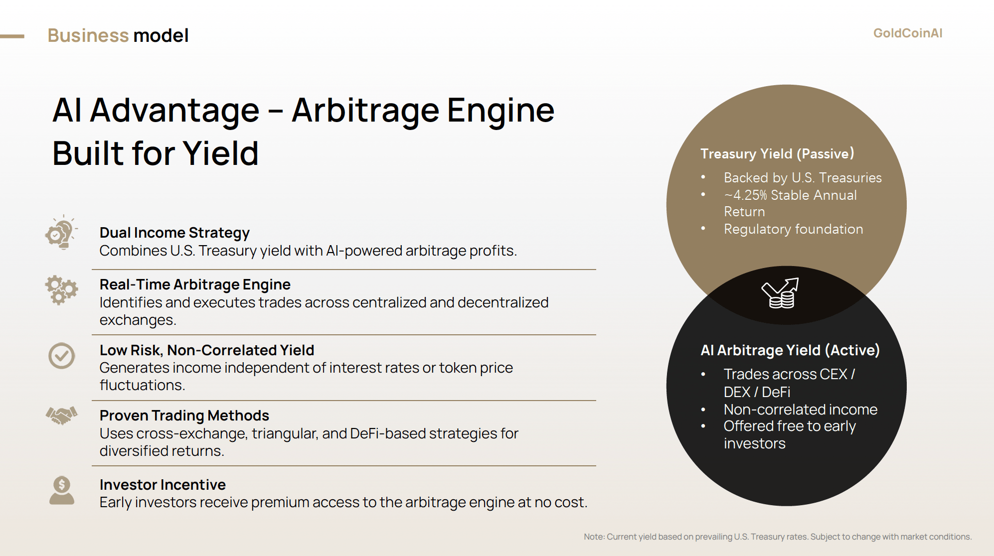 Gold Coin AI generates value through a dual-income model designed for both safety and performance. First, each token is fully collateralized with short-term U.S. Treasury bills, providing a stable, government-backed yield. Second, an AI-powered arbitrage engine actively identifies and executes trading opportunities across centralized and decentralized exchanges—generating consistent, non-correlated profits. This approach combines the reliability of traditional finance with the agility of AI-driven strategies, offering a low-risk yield that doesn’t depend on token price movements.