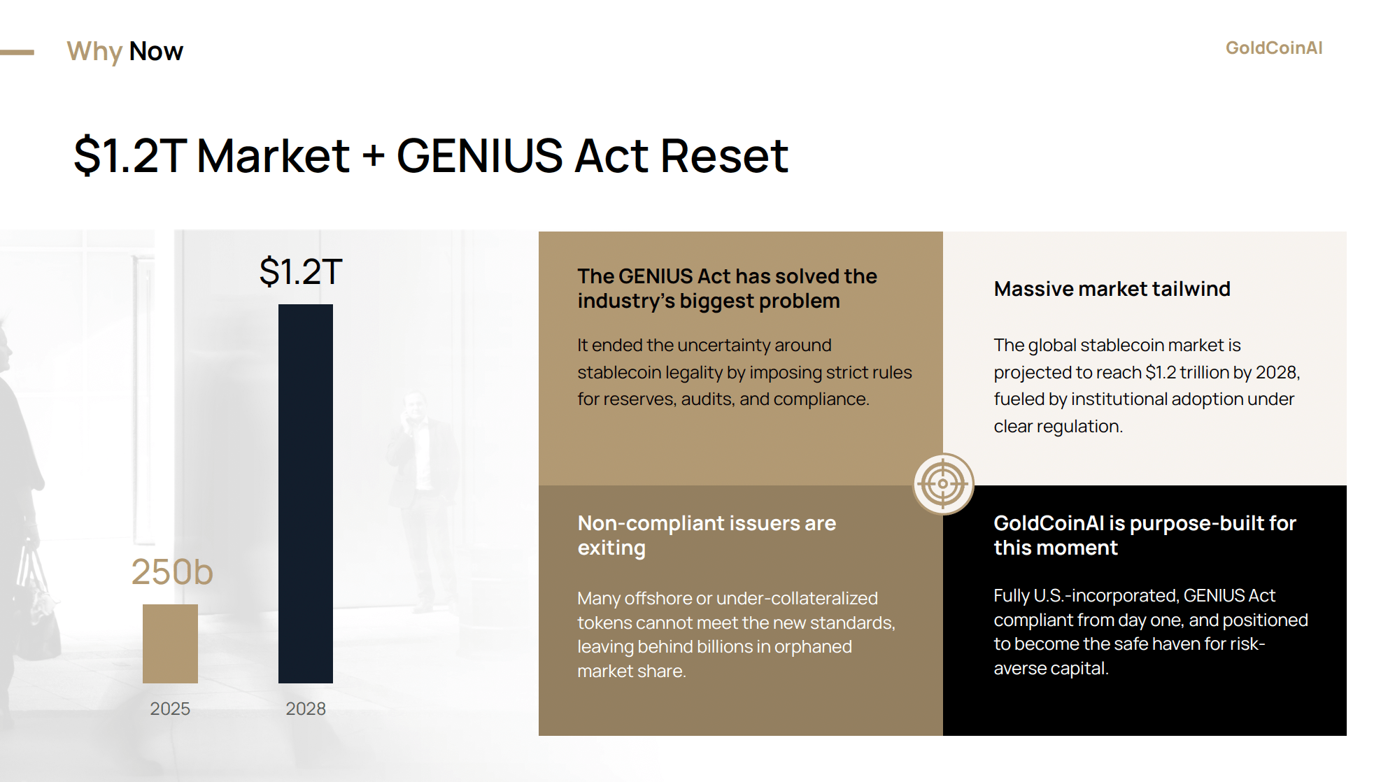 • Non-Compliant Issuers Are Exiting: Offshore and opaque stablecoin projects are being pushed out of the U.S. market, creating a rare opportunity for compliant, transparent alternatives like Gold Coin AI to capture market share.